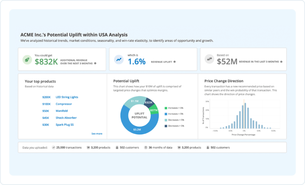 Bleiben Sie wettbewerbsfähig, indem Sie Ihre Preisstrategien an veränderte Marktbedingungen anpassen. KI erkennt Muster in Preistrends, aggregiertes Kundenverhalten und Marktveränderungen, um Ihnen zu helfen, im Laufe der Zeit intelligentere Preisentscheidungen zu treffen.