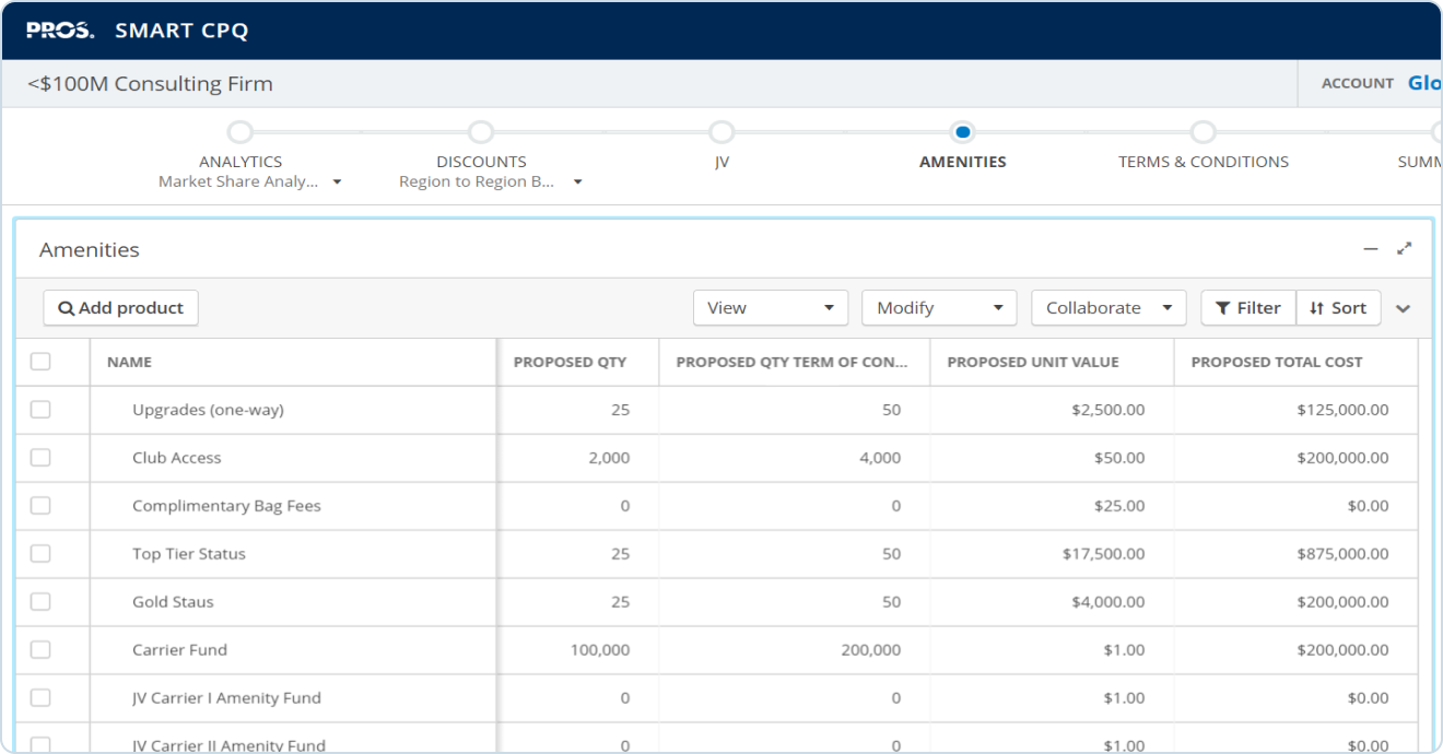 Erleichtern Sie die Zusammenarbeit mit Ihren Partnern und beschleunigen Sie die Bearbeitungszeiten für Angebote mit einem integrierten Tool für Unternehmensgeschäfte. Die PROS Corporate Sales-Lösung ermöglicht Joint-Venture- und Allianzpartnern den Zugriff auf die erforderlichen Informationen und die Verwaltung ihrer Anteil des Vertrags, wodurch Silos abgebaut werden und die Zusammenarbeit verbessert wird.
