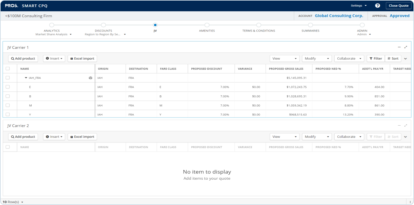 Gewinnen Sie mehr Geschäfte mit genaumaßgeschneiderte Angebote in wenigen Minuten. PROS Corporate Sales automatisch erzeugt Angebote und wendet die richtigen Rabatte an und Vergünstigungen auf der Grundlage des jeweiligen Unternehmenskontos und helfen Ihnen, die besten Angebote, schneller.