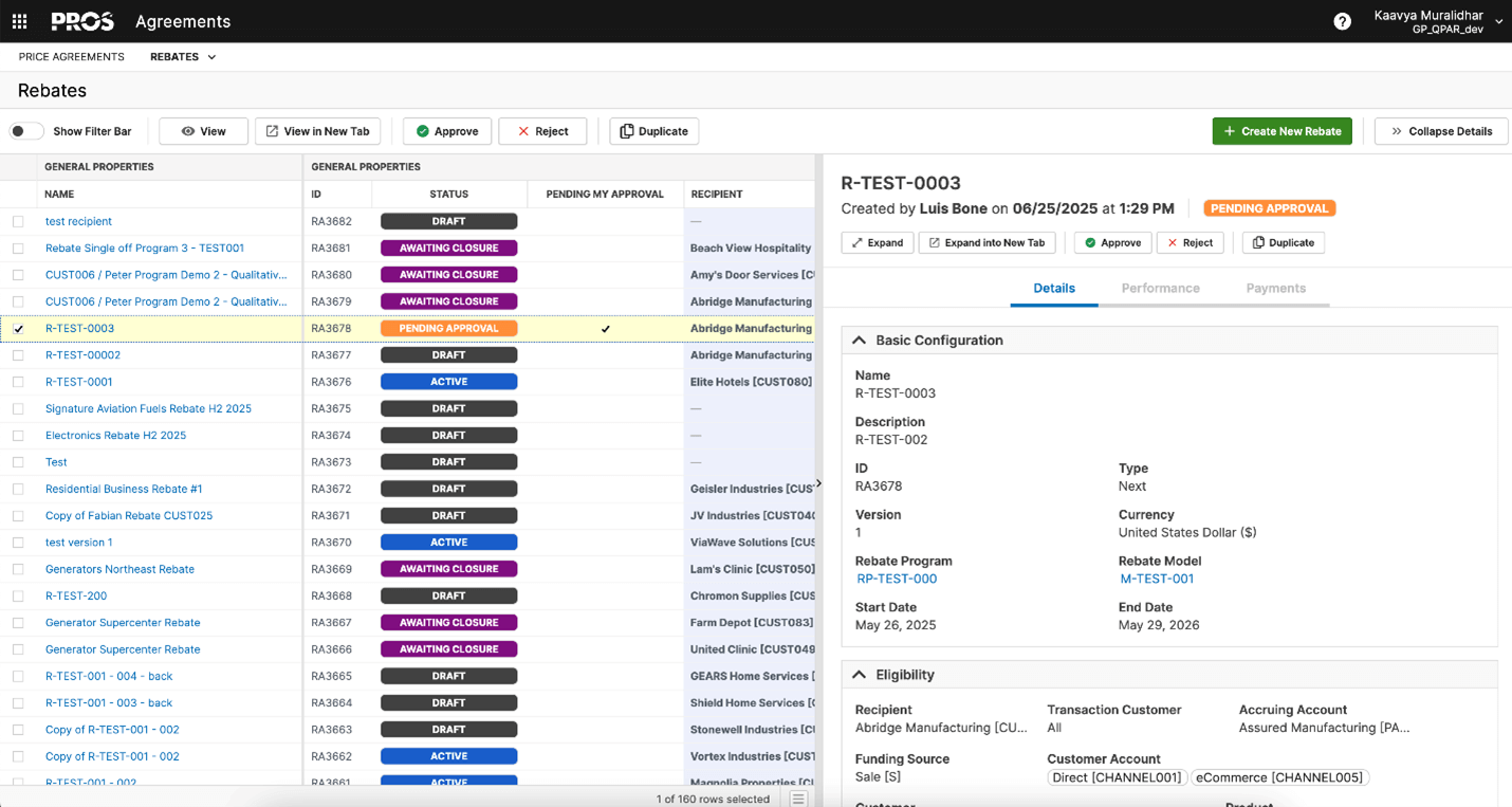 - PROS Rebate Agent (in development): This agent simplifies rebate creation and management by guiding you through the process in, helping you define criteria, calculate thresholds, and structure incentives. Once approved, the rebate is automatically generated.
