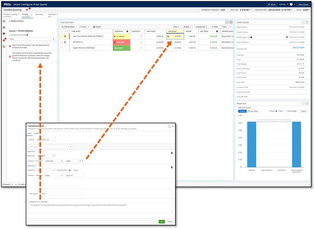 The new Personalized Validation Rules feature transforms how sales reps handle complex quotes. When reps enter values that violate predefined business rules, tailored error messages appear in the Error Browser—a centralized component that consolidates both technical and validation errors within a quote.