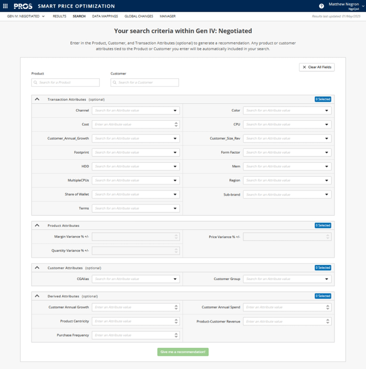 The search experience in Smart Price Optimization now includes visibility into product, customer, and derived attributes alongside traditional transaction attributes. You can view and specify these attributes directly when performing searches, enabling more granular and tailored recommendations.