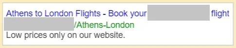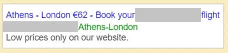 Dynamic Price Insertion of €62 in same ad for flights from Athens to London