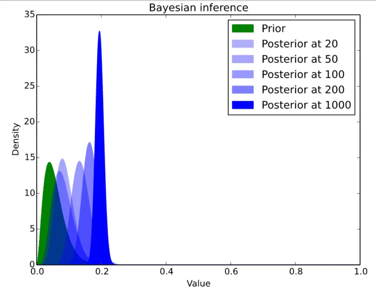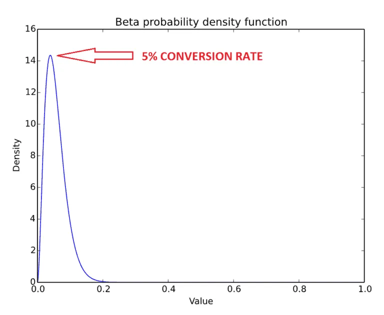 It starts with identifying prior beliefs – or “prior” – about what results are likely, and then updating those according to the data collected. For example, if the current conversion rate is 5% it is very unlikely to achieve a conversion rate higher than 20%: