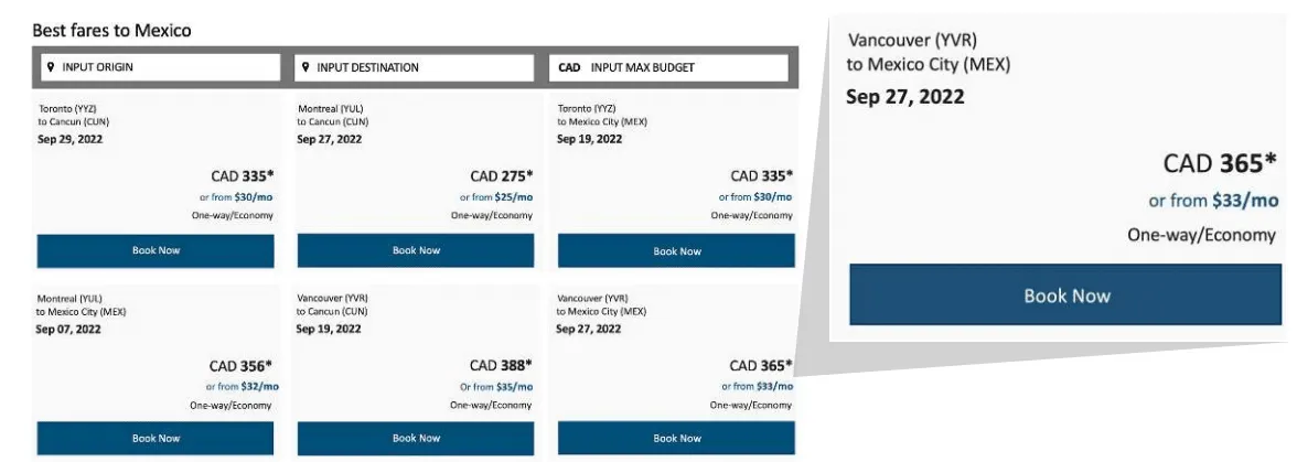 Air Canada wanted to see if offering monthly payment plans would entice people to travel when they might not have otherwise. The airline used Uplift to generate payment plans as low as $20 per month as an alternative to paying a full fare upfront. With the PROS fare marketing platform, Air Canada could instantly display these payment plans at scale across all of their origin and destination pages. After launching the monthly pay option, Air Canada saw an increase in conversions, average transaction value, and customer acquisition, plus longer booking windows.